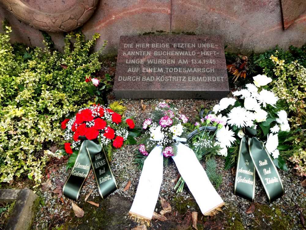 Bürgermeister Dietrich Heiland sprach am Grabmal der von SS Schergen auf dem Todesmarsch durch Bad Köstritz ermordeten Häftlinge mahnende Worte des Gedenkens. Leider durfte der zu dieser Zeit übliche Buchenwaldgedenklauf u. a. mit Schüler der Regelschule und den Kindern des LAV Elstertal Bad Köstritz e.V. auf Grund der Pandemiesituation nicht stattfinden. Daher ehrte der Bürgermeister im kleinen Kreis  im Beisein des 1. Beigeordneten Dr. Uli Gelbrich (CDU), des 2. Beigeordneten, Oliver Voigt (FWG); der Fraktion der LINKEN und deren Fraktionsvorsitzenden, Marlies Jakat sowie dem Vorsitzenden des Thüringer Verbandes VDN/BdA e.V. Basisgruppe Gera, Günter Domkowsky die Opfer der faschistischen Barbarei.