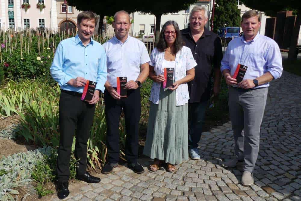 Der Geschäftsführer der Köstritzer Schwarzbierbrauerei, Uwe Helmsdorf präsentiert gemeinsam mit dem Geschäftsführer des Chemiewerks Bad Köstritz, Dr. Lars Böttcher, der Kulturamtsleiterin Anne-Cathrin Ritschel, dem Geschäftsführer der EWU, Lutz Köhler und dem Bürgermeister Oliver Voigt (v.l.) den Programm-Flyer zum 44. Dahlienfest