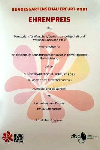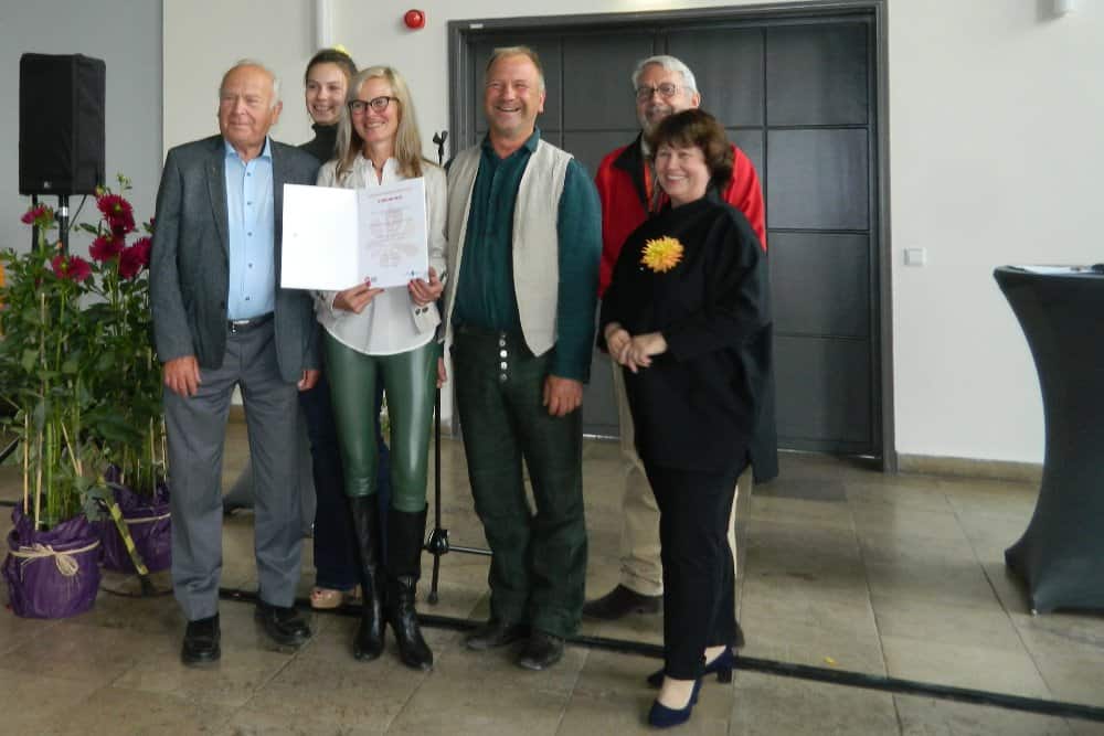 Gewürdigt wurden unserer BUGA-Präsentationen: „Thüringen – geehrt durch Dahliennamen“ (im April), die „Thüringen-Schau“ (Anfang September) und die Dahlien-Hallenschau „Humboldt und die Dahlien“ (Mitte September) mit: