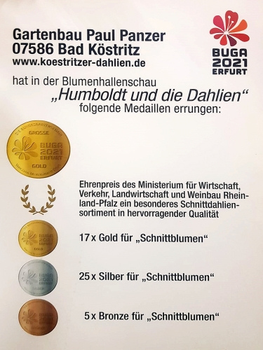 - Als Referenz an die Thüringer BUGA 2021 wurde der spezielle Weg der Dahlie von Humboldts aktiver Rolle im Preußisch-Berliner Botanischen Garten zu den Thüringer Residenzen in Weimar und im Reußischen Köstritz aufgezeigt. Die Köstritzer Dahliengeschichte begann vor 212 Jahren in den Hofgärten, bevor die Altmeister Deegen, Sieckmann und Herger den Ruhm von Köstritz – als einer Wiege der deutschen Dahlienzucht – besiegelten. Über 2 Jahrhunderte dauert diese Tradition bereits an und wird im Geiste bewahrt durch unser Dahlienzentrum, stets in enger Kooperation mit der einzigen Thüringer Dahlienzucht-Gärtnerei „Paul Panzer“.