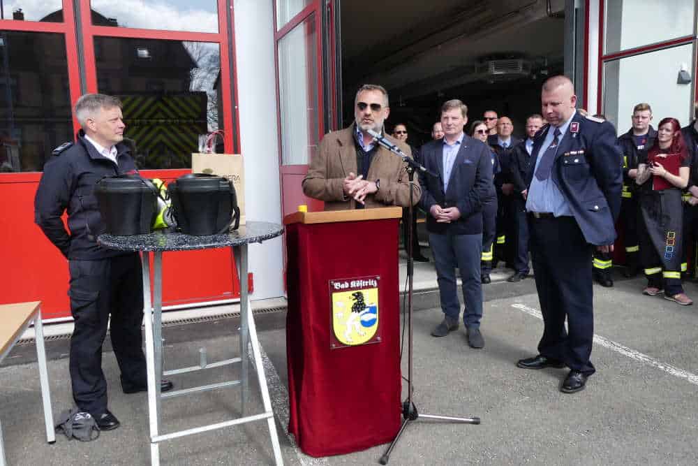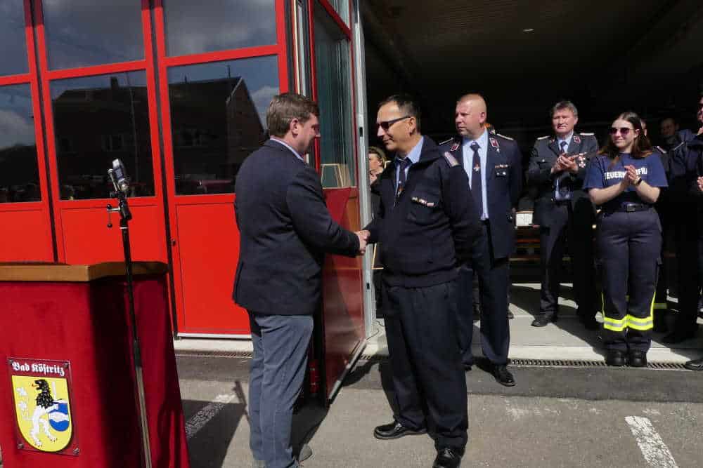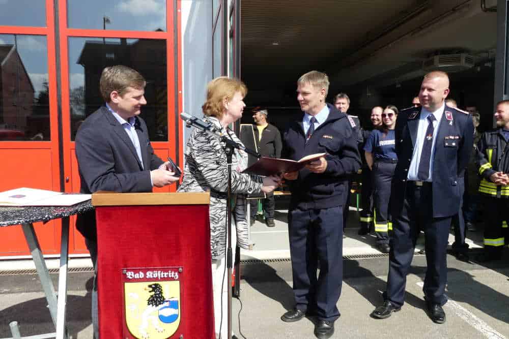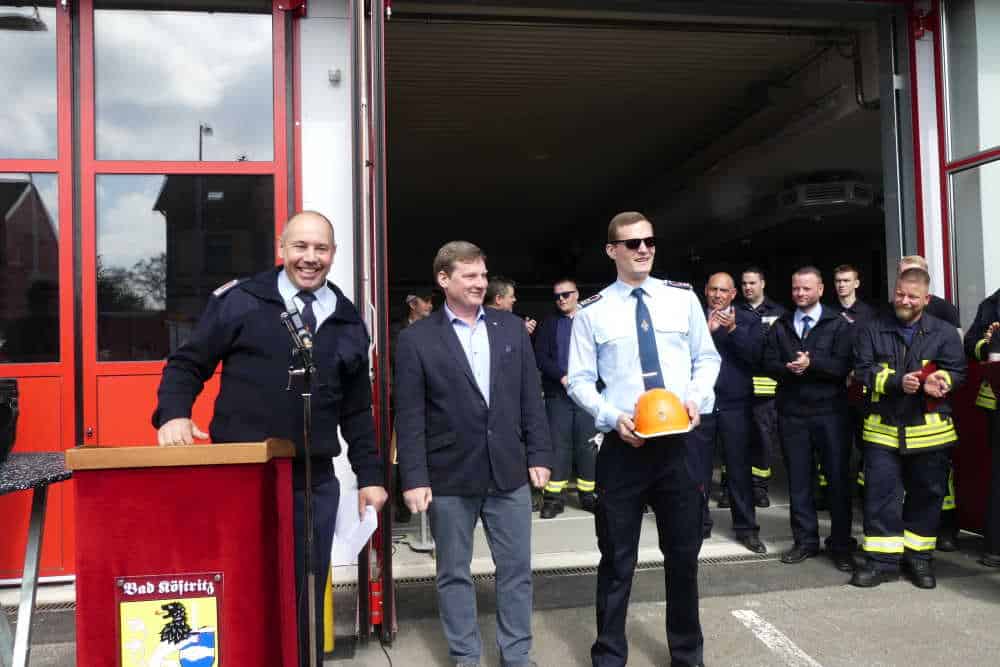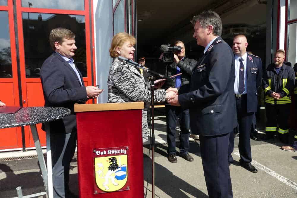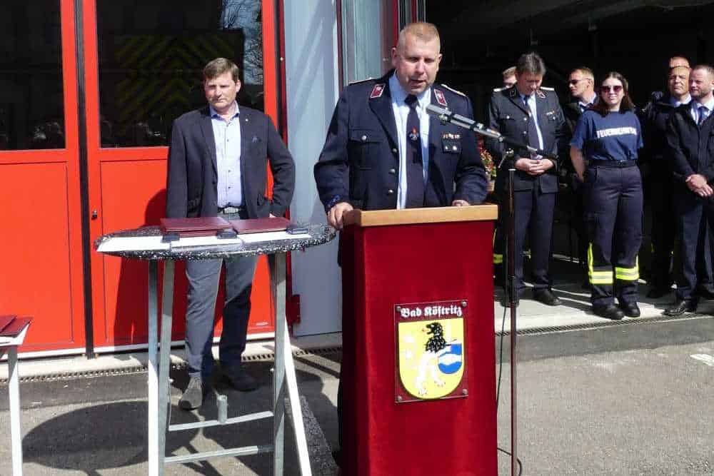 Am 23. April erfolgte die offizielle Übergabe des neuen Gebäudes in der Bahnhofstraße an die Kameradinnen und Kameraden der Freiwilligen Feuerwehr Bad Köstritz durch Bürgermeister Oliver Voigt. Umgezogen waren sie bereits am 1. Januar 2022. Der Bürgermeister begrüßte die zahlreich erschienenen Gäste, unter ihnen auch Landrätin Martina Schweinsburg, Oberbürgermeister Julian Vonarb, Stadträte, am Bau Beteiligte und viele Köstritzer Bürgerinnen und Bürger, die gekommen waren, um Glückwünsche zu überbringen und das neue Feuerwehrgerätehaus in Augenschein zu nehmen.