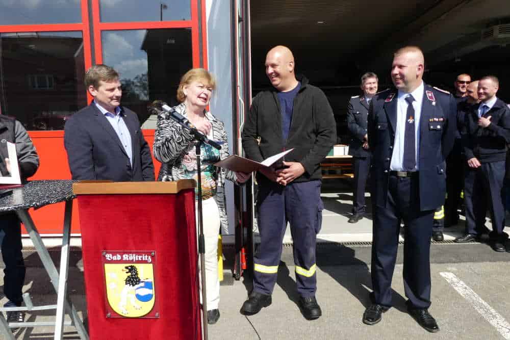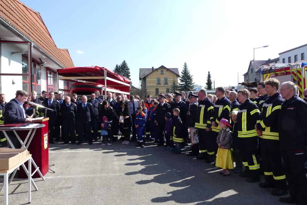 Der Vorsitzende des Fördervereins der Freiwilligen Feuerwehr Bad Köstritz, Ronald Hüttner, konnte die neue Qualität des Gebäudes der Feuerwehr mit seinen Worten „Es war ein Quantensprung!“ wohl kaum besser beschreiben. Endlich ist viel Platz für Technik, Fahrzeuge, Schulungsräume und Umkleidemöglichkeiten. Der Verein hatte im vergangenen Jahr aus zusammen getragenen Spendengeldern in Höhe von 8700,- Euro den Umbau eines Anhängers für das Schlauchbot und die Anschaffung von Ausrüstung zur Waldbrandbekämpfung ermöglichet, informierte Hüttner. Das nächste große Ziel sei die Anschaffung eines MTW für die Feuerwehr in Reichardtsdorf.