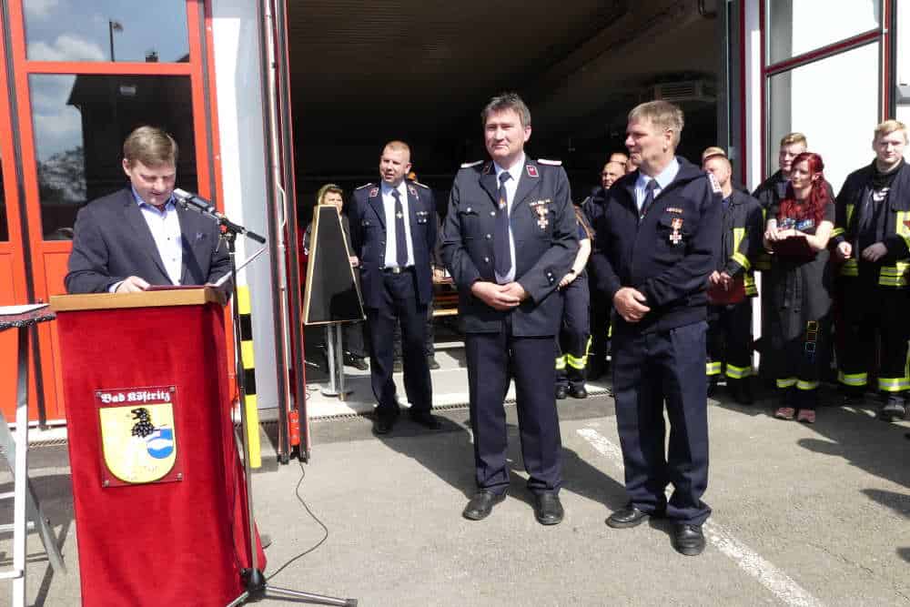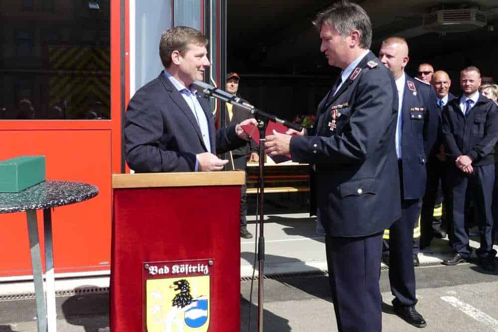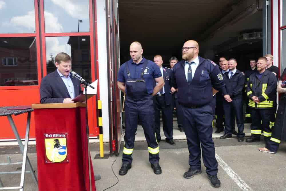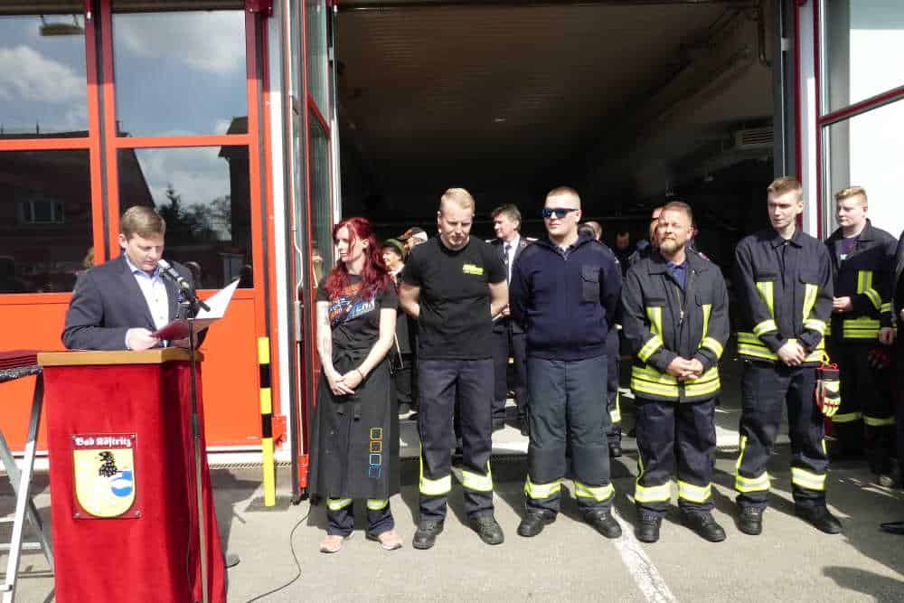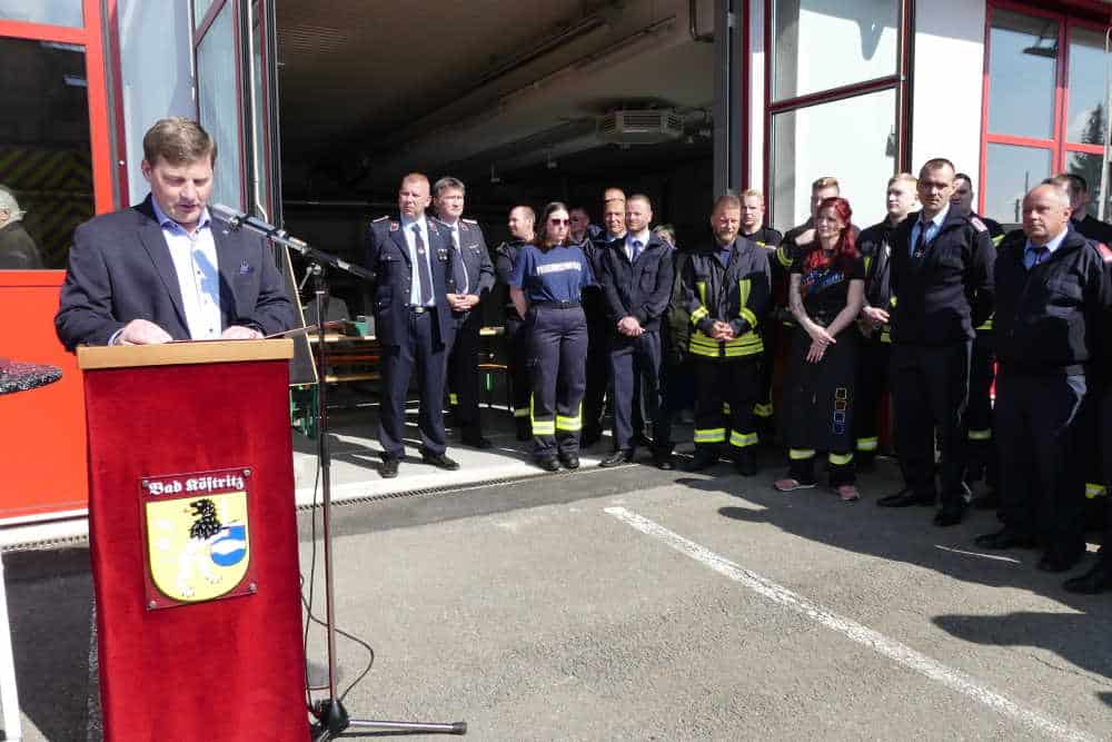 Das alte Feuerwehrgebäude war zu klein, nicht funktional, mit Mängeln behaftet und ohne ausreichende Umkleidemöglichkeiten und Sanitärräume ausgestattet, informierte Bürgermeister Oliver Voigt. Somit fände mit diesem Tag der Umbau des alten Plus Marktes zum Feuerwehrdepot und neuen Heimstatt für den Bauhof, seinen Abschluss. Mehr als 100 Einsätze der 41 aktiven Kameradinnen und Kameraden pro Jahr machten die Unverzichtbarkeit dieser Investition deutlich. Der Bürgermeister betonte, wie wichtig eine zweckmäßige und bedarfsgerechte Ausstattung und funktionale Unterkunft der Feuerwehr für den Schutz der Menschen und ihrer Sachgüter in einer Gemeinde sei. Die Stadt Bad Köstritz trug die größte finanzielle Last für den Umbau. Von den insgesamt 2 Millionen Euro Kosten förderte das Land Thüringen die vier Stellplätze mit 280.00 Euro. Vom einstimmigen Beschluss zum Kauf des Plusmarktes im Jahr 2017 vergingen fast drei Jahre, bevor am 3. Februar 2020 mit der ersten Bauanlaufberatung der Umbau startete. Der Bürgermeister dankte allen am Bau Beteiligten: den Planern, ausführenden Firmen, den beiden Mitarbeiterinnen des Bauamtes der Stadt, die alle in enger Abstimmung mit der Wehrleitung zum Erfolg des Projektes beigetragen haben. Respekt und Anerkennung zollte er den Kameradinnen und Kameraden für ihre ehrenamtlichen Arbeit in der Freiwilligen Feuerwehr Bad Köstritz, für die stete Bereitschaft an 365 Tage im Jahr und 24 Stunden am Tag.