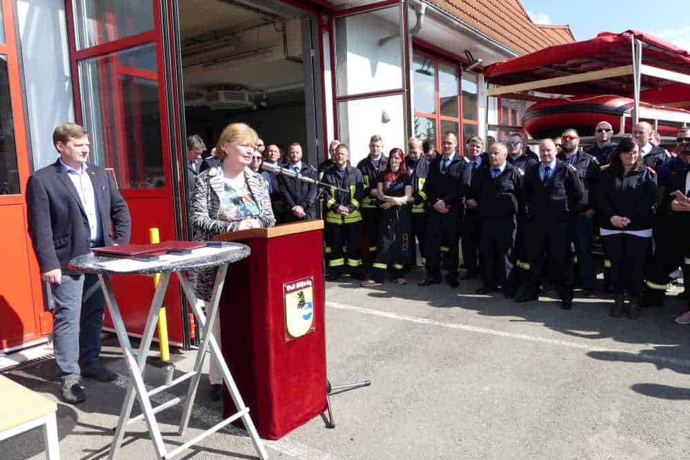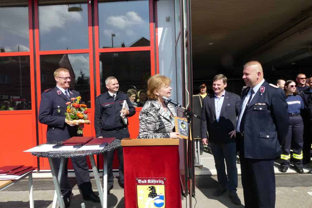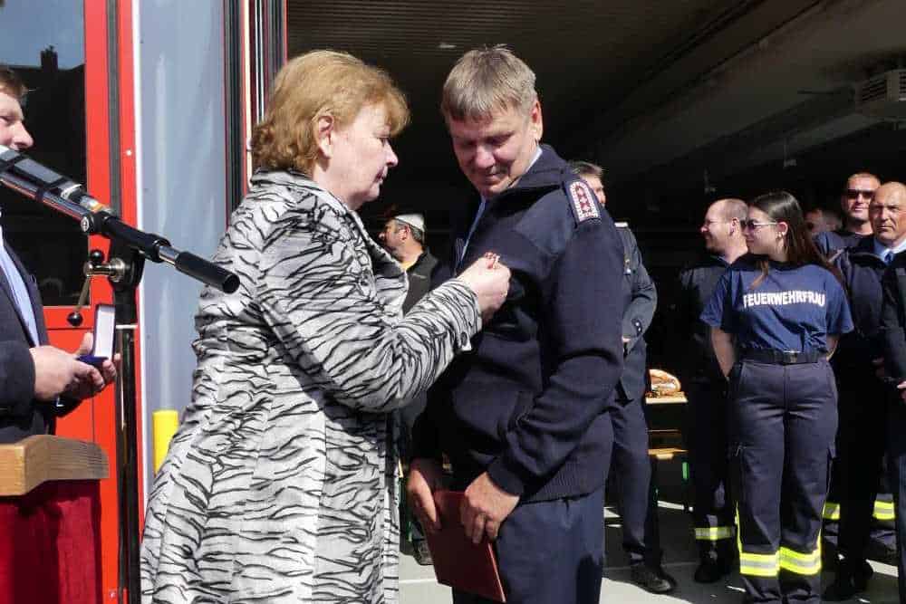 Landrätin Martina Schweinsburg und Geras Oberbürgermeister Julian Vonarb gratulierten zum neuen Feuerwehrgerätehaus und wünschten alles Gute, Gesundheit und wenige Einsätze. Die Landrätin ließ es sich nicht nehmen selbst die Brandschutzehrenzeichen anzuheften und die Urkunde des Thüringer Innenministers zu übergeben. (siehe unten)