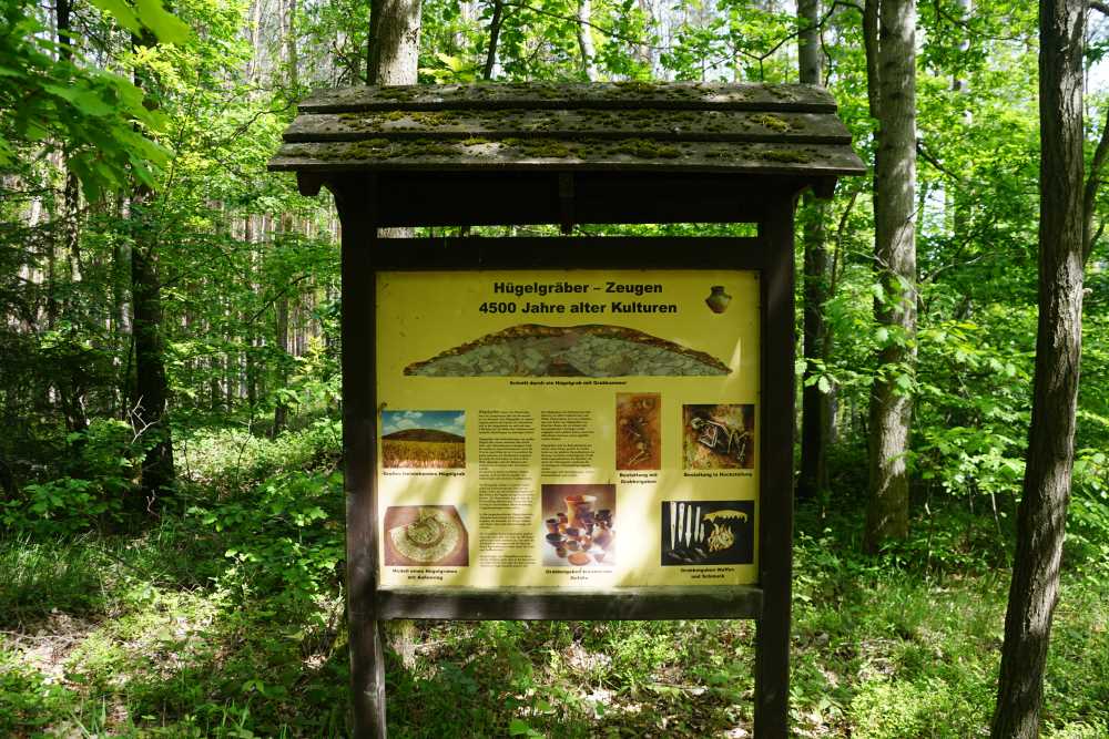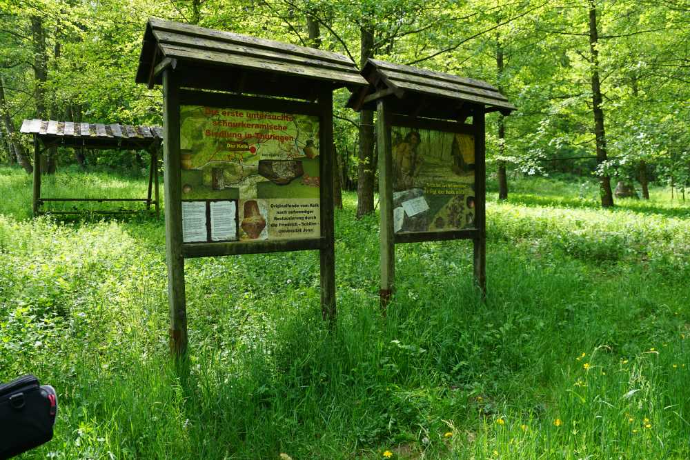 Seguimos el camino señalizado hasta el aparcamiento del bosque y pasamos otro túmulo. Allí nos informamos en un tablón de anuncios sobre la siguiente ruta. A lo largo de las marcas, el camino conduce a través del bosque hasta la pequeña zona de descanso en el „Borngrund“ cerca de Gleina. Aquí, los paneles proporcionan información sobre las excavaciones en el „Kolk“, el lugar donde se encontraron „cerámicas con cordones“ del Neolítico. Un asentamiento con hallazgos de estas vasijas de arcilla se examinó aquí por primera vez en Turingia. (Lámina 6)