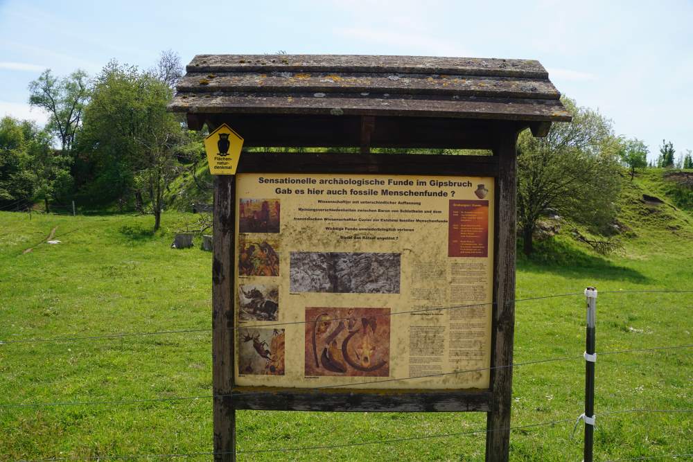 Siga por Werner-Sylten-Straße durante unos 200 m hasta el cruce de la izquierda en Gleinaer Weg y, después del parque, continúe a la derecha hasta la antigua „Villa Zersch“. Allí cruzamos el 12º grado de longitud y giramos hacia „Gipsbruch“. Para ello, bajamos la montaña y seguimos el carril bici durante unos 200 metros en dirección a Caaschwitz hasta el siguiente cruce. Un poco más tarde llegamos al punto donde el yeso se extraía comercialmente hasta 1919. Esta cantera de yeso fue importante para la investigación histórica debido a los espectaculares hallazgos arqueológicos del asesor de la corte de Köstritz y el doctor Dr. Schottin y el barón von Schlotheim de Gotha en los años 1820 a 1828. Además de los restos de varios animales de la Edad del Hielo, también encontraron huesos esqueléticos humanos. (Panel 1)