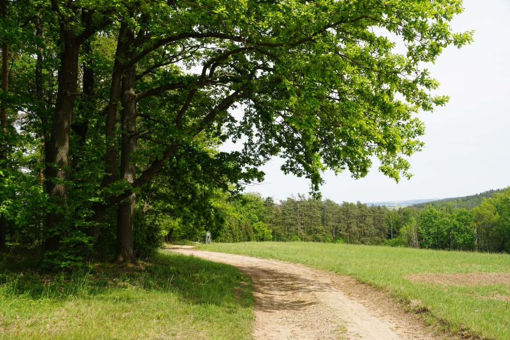 Después de unos 500 m se llega a una meseta en el camino alto sobre Gleina, que nos ofrece una vista maravillosa sobre el pueblo y el valle del Elster Blanco frente a él.