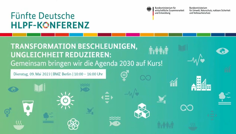 Am Dienstag den 9. Mai 2023 tagte in Berlin die Fünfte Deutsche „High Level Political Forum“ (HLPF) Konferenz. Unter Anwesenheit von Bundesministerin für wirtschaftliche Zusammenarbeit und Entwicklung, Svenja Schulze und Bundesministerin für Umwelt, Naturschutz, nukleare Sicherheit und Verbraucherschutz, Steffi Lemke diskutierten hochrangige Vertreter aus Zivilgesellschaft, Wirtschaft, Wissenschaft und Politik Ideen für eine beschleunigte und ambitionierte Umsetzung der Agenda 2030.