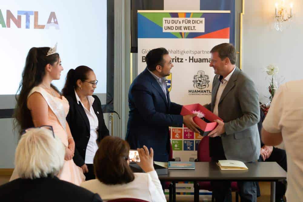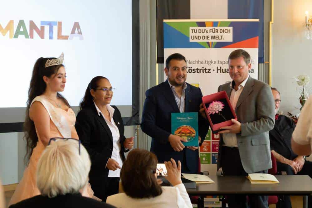 Das breit aufgestellte Besuchsprogramm, das im Vorfeld mit den Mexikanern über Videokonferenzen abgestimmt wurde, war anspruchsvoll und deckte viele Facetten der bisherigen und künftigen Zusammenarbeit der Agenda 2030 ab. Als einer der Höhepunkte des Besuchs wird die Unterzeichnung des Partnerschaftsvertrages zwischen den Städten Bad Köstritz und Huamantla eingeschätzt. Bürgermeister Oliver Voigt sprach in seiner Rede beim offiziellen Empfang im Köstritzer Palaissaal von einem historischen Ereignis, die Bad Köstritz in seinen Bemühungen um die Globale Nachhaltigkeit einen entscheidenden Schritt weiterbringt. Der Oberbürgermeister der 100.000-Einwohner Stadt Huamantla dankte der Stadtverwaltung Bad Köstritz und allen beteiligten Akteuren für die Einladungen und die großartige Gastfreundschaft, die er und Kulturkoordinatorin Isabel Aquino Romero, Stadtratspräsidentin Eva Valencia und Nachhaltigkeitsbeauftragter Abelardo Ruiz Acevedo während des Besuches erfahren durften. Begleitet und übersetzt wurde das Besuchsprogramm von der Dahlienkönigin Michaela Grace I. und weiteren professionellen Dolmetschern.