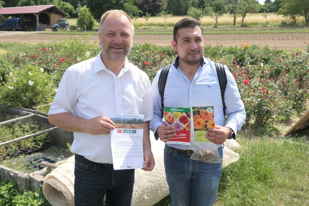 Die Reise begann aufgrund der langen Verbindungen zwischen dem Dahlienzentrum Bad Köstritz und der mexikanischen Dahliengesellschaft beim Gartenbaubetrieb Paul Panzer. Tochter Anne-Sophie überraschte mit verschiedenen schmackhaften Dahliengerichten aus ihrem Kochbuch, dass sie auf der Grundlage der Rezepte von Guadalupe Treviño de Castro (kurz: Lupita), der Präsidentin der mexikanischen Dahliengesellschaft erstellt hat. Dirk und Katrin Panzer führten durch die Gärtnerei. Ehre wurde den Gästen zum einen mit der Taufe einer Neuzüchtung einer Dahlie auf den Namen „Huamantla Magico“ zuteil. Zum anderen verlieh Bürgermeister Oliver Voigt Juan Salvador Santos Cedillo für sein großes Engagement an dem Abend nach einer Laudatio von Wolfgang Ritschel die Christian-Deegen-Gedenkmedaille.