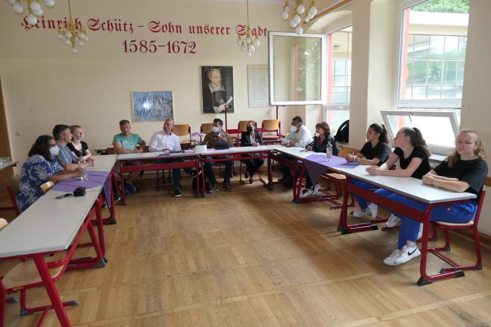 Am Folgetag besuchten die Gäste zunächst die Regelschule Bad Köstritz. Dort boten die Schülerinnen und Schüler verschiedener AGs ein buntes Programm von Tanz, Gesang und Musik. Unerwartet konnten die Kinder und Jugendliche der AG Aquaristik die Mexikaner beeindrucken. In eines der Aquarien schwimmen „Axolotl“. Die vom Aussterben bedrohten Tiere sind für Mexikaner heilig und zieren sogar die Rückseite des 50-Peso-Scheins, der 2021 als schönste Banknote der Welt gekürt wurde. Bei leckeren Gerichten des Schulprojekts „Essen statt Tonne“ tauschte man sich über den Schulalltag beider Länder aus. Dabei spielte die künftige Schulpartnerschaft mit der CBTIS 61 in Huamantla eine tragende Rolle.