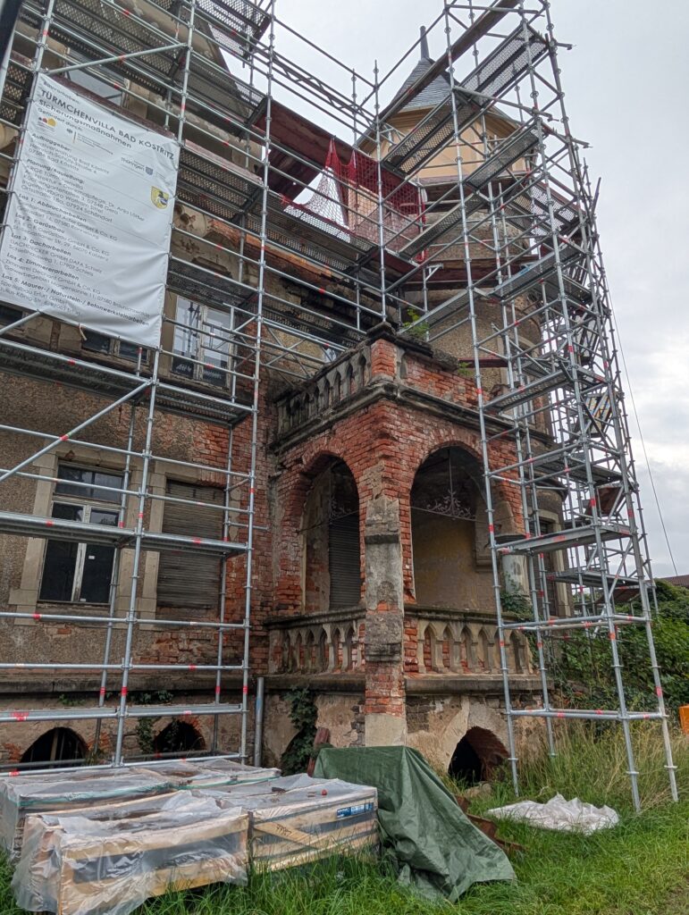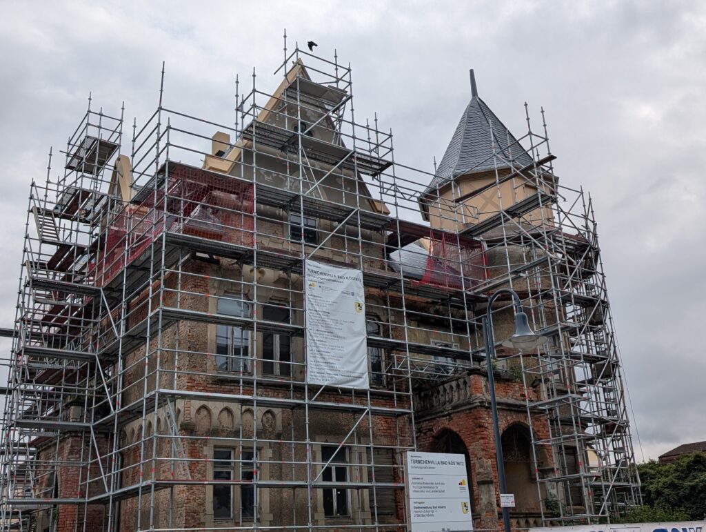 Die Türmchenvilla ist seit fünf Jahren Teil einer „städtebaulichen Gesamtmaßnahme“, wie es im Amtsdeutsch heißt. Praktisch heißt das: Es fließen Fördermittel, ohne die die Stadt gar nichts an der Villa machen könnte. Was ist erreicht? Es regnet nicht mehr herein. Es gibt eine komplette Instandsetzungsplanung. Arbeiten, die ursprünglich schon im vergangenen Jahr beginnen sollten, laufen nun. Ein nicht zu rettendes Nebengelass ist abgerissen, das Grundstück entrümpelt, das Haus eingerüstet. Dachdecker, Zimmerer und Maurer können arbeiten- für mehr als eine halbe Million Euro. Und welche Freude: Entgegen früherer Berechnungen reicht das Geld sogar, den Turm neu zu bekrönen.