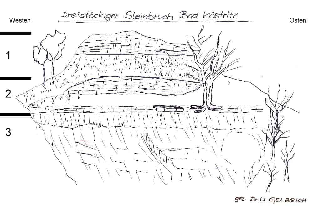 Bei diesem seltenen und besonders interessanten Aufschluss ist schön zu erkennen, wie auf den senkrecht stehenden kulmischen Schieferschichten (entstanden durch Auffaltung) die Kalkbänke des Zechsteins waagerecht aufliegen. Die senkrechten kulmischen Schiefer wurden zu einer waagerechten Oberfläche durch das Rotliegende abgetragen. Die ca. 75 cm oberen Schieferschichten sind ausgebleicht. Das Zechsteinmeer überflutete vor 225 Mio. Jahren periodisch die eingeebneten Schichten des Karbon und lagerte bankweise Kalkstein, Mergel und Dolomit ab.