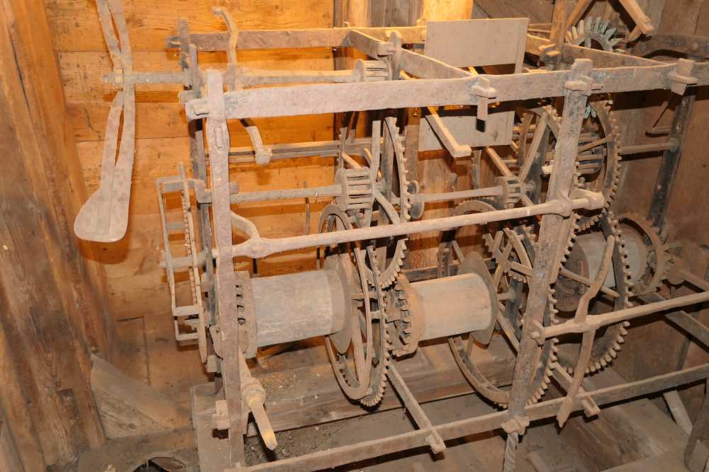 Dieses handgeschmiedete Uhrwerk ist immer noch auf dem Kirchturm vorhanden.  Diese Linie der Familie von Wolfframsdorff  waren auch die Kirchen-Patrone, von ihnen sind mindestens 11 Mitglieder in der Kirche beigesetzt. Nach dem Tod von Heinrich Siegmundt v. W. im Jahr 1742 kauften die Köstritzer Reussen 1758 die Güter Dürrenberg und Hartmannsdorf  und waren dann auch die Kirchenpatrone.